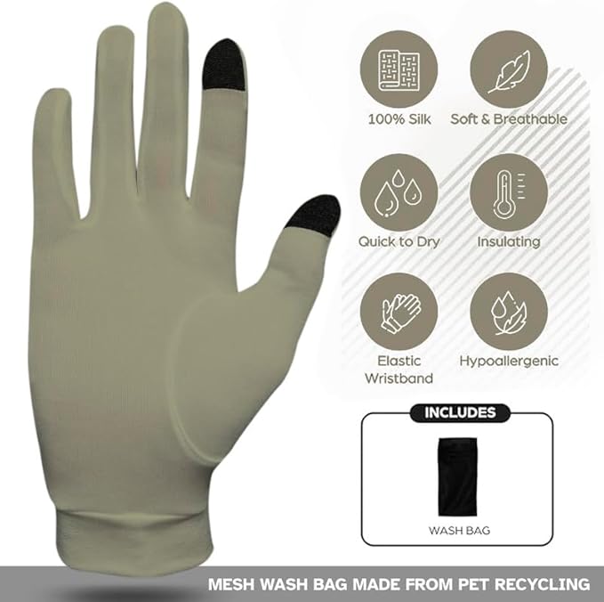 These 100% silk gloves are soft, breathable, and quick-drying, offering thermal insulation and a snug fit with their elastic cuff. They’re hypoallergenic and come with a recycled mesh bag for safe washing.